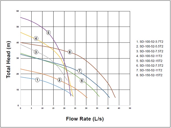 | Model Number | Discharge (mm) | Power (kW) | Voltage (V) | Cable (m) | Max Flow (L/s) | Shut-Off Head (m) | Pump Weight (kg) | Max Solid (mm) | Rated Current A (415 V) |