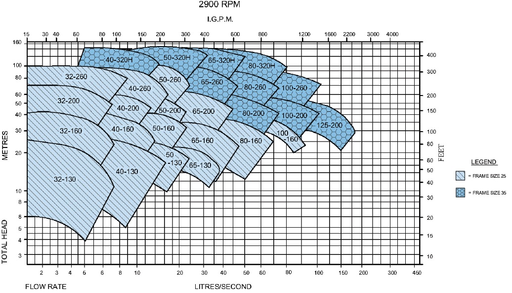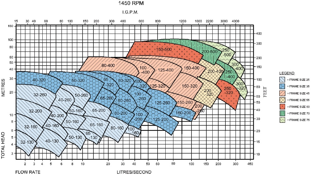 | Model Number | Suction (mm) | Discharge (mm) | Min Impeller (mm) | Max Impeller (mm) | Pump Frame Size | Pump Weight (kg) | Max Operating Speed (rpm) |